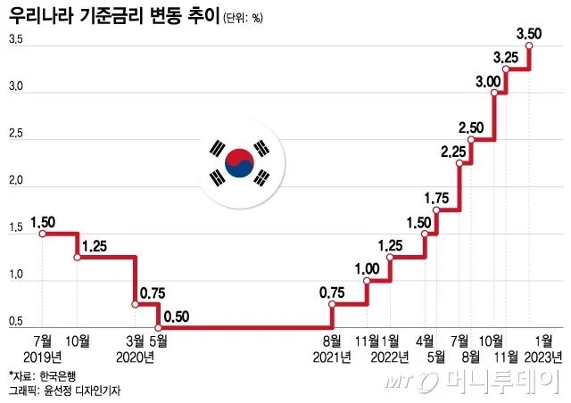 우리나라 금융통화위원회는 물가를 잡기 위해 지속적으로 금리를 인상하고 있는데 지난 1월 13일 0.25%p 인상함으로써 7회 연속 인상 금리가 저점이었던 2021년 8월부터 올 1월까지 3%p가 올랐다.