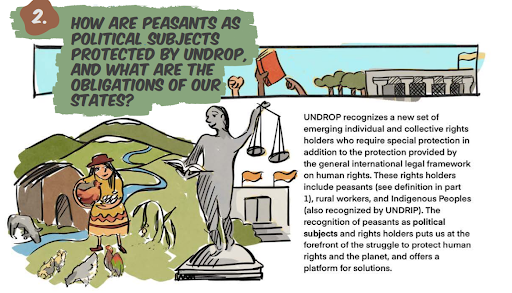 비아캄페시나는 상징적인 승리에만 그치지 않고 신속하게 UNDROP에서 제공하는 도구를 각 회원국에 전달하여 지역 캠페인을 지원했다. 2020년에 아르헨티나 법원에서는 결정문에 UNDROP을 인용하며 원주민 공동체의 토지에 관한 권리를 인정했다. 대규모 팜유 플랜테이션에 반대하는 집회를 했다는 이유로 인도네시아 정부가 인도네시아 농민조합(SPI) 회원 5명을 체포했을 때, 비아캄페시나와 SPI는 UNDROP에 보장된 권리를 활용하여 인도네시아 정부가 구류된 4명의 농민을 석방하도록 압박했다. 그리고 네팔 농민들이 그러했듯이, UNDROP으로 농민들이 각국 정부에서 새 입법에 나설 수 있는 문이 열렸다는 것이 가장 중요하다.